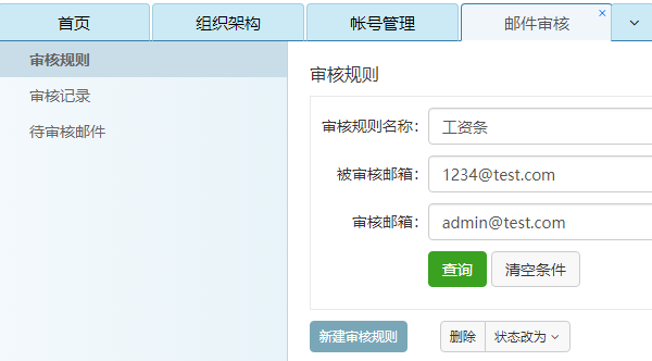 (图:网易企业邮箱的“邮件审核“功能,管理员可通过建立审核规划对工资条、合同、审计报告等敏感信息进行管控,审核人同意通过后方可发送)