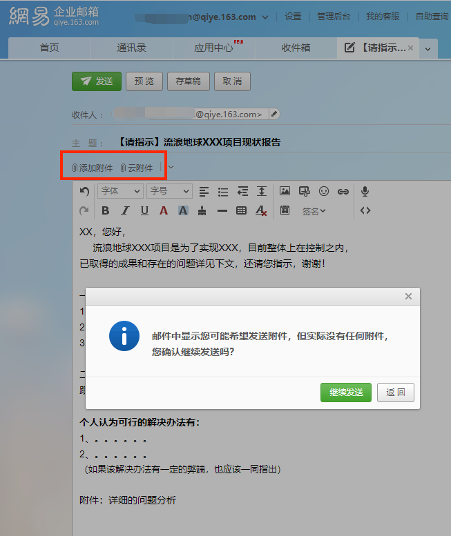 (图:网易企业邮箱发信场景,点击发送时自动弹出提醒框,避免忘记添加附件的尴尬)