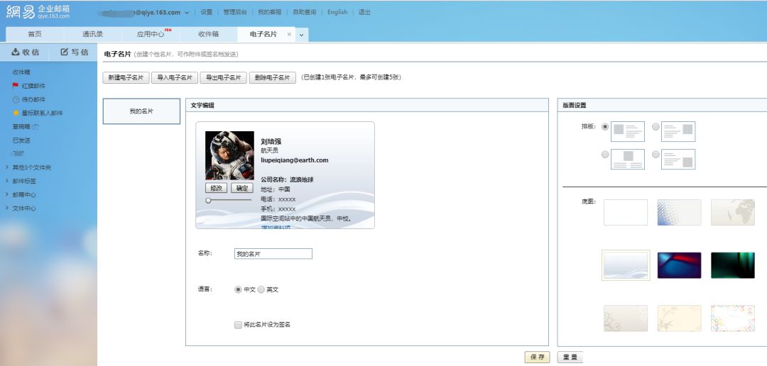 (图:网易企业邮箱个性电子名片创建界面,多种版面设置排版及精美底图选择)
