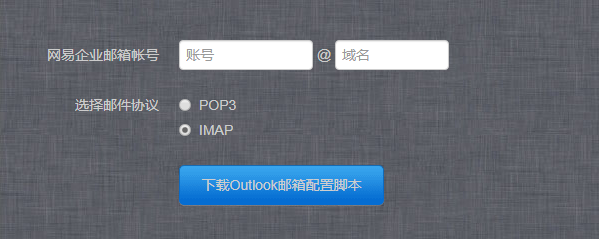 1、输入完整的邮箱地址、选择邮件协议,点击“下载Outlook邮箱配置脚本”。【企业邮箱申请】